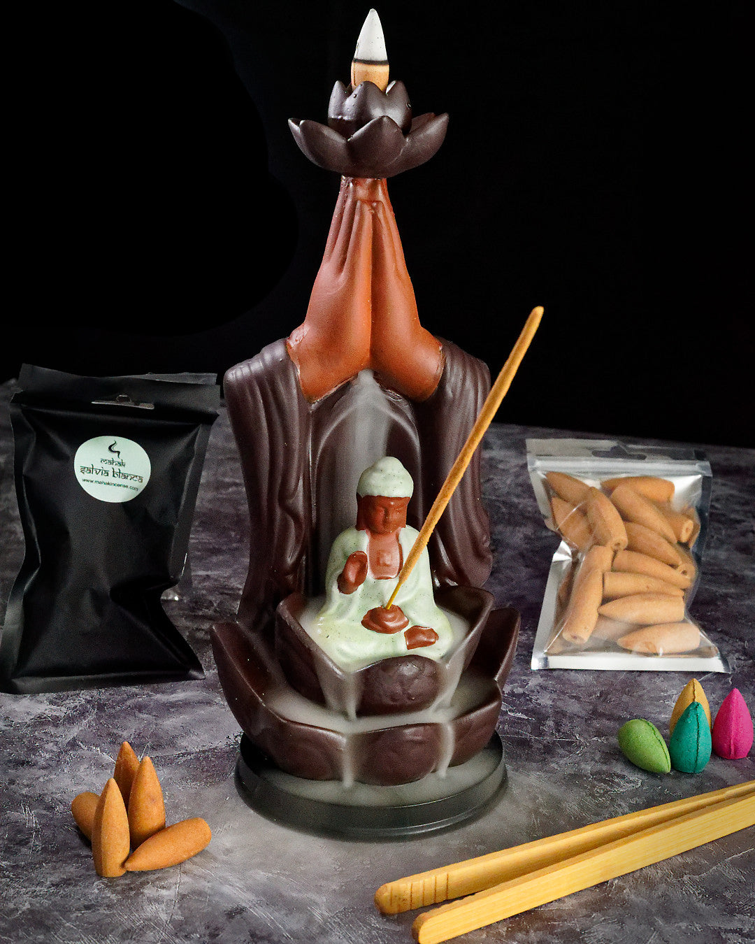 Este portainciensos Buda está diseñado para aprovechar la magia de los inciensos backflow. Al encenderlo, el humo desciende lentamente en una cascada fascinante, creando una atmósfera de paz absoluta.